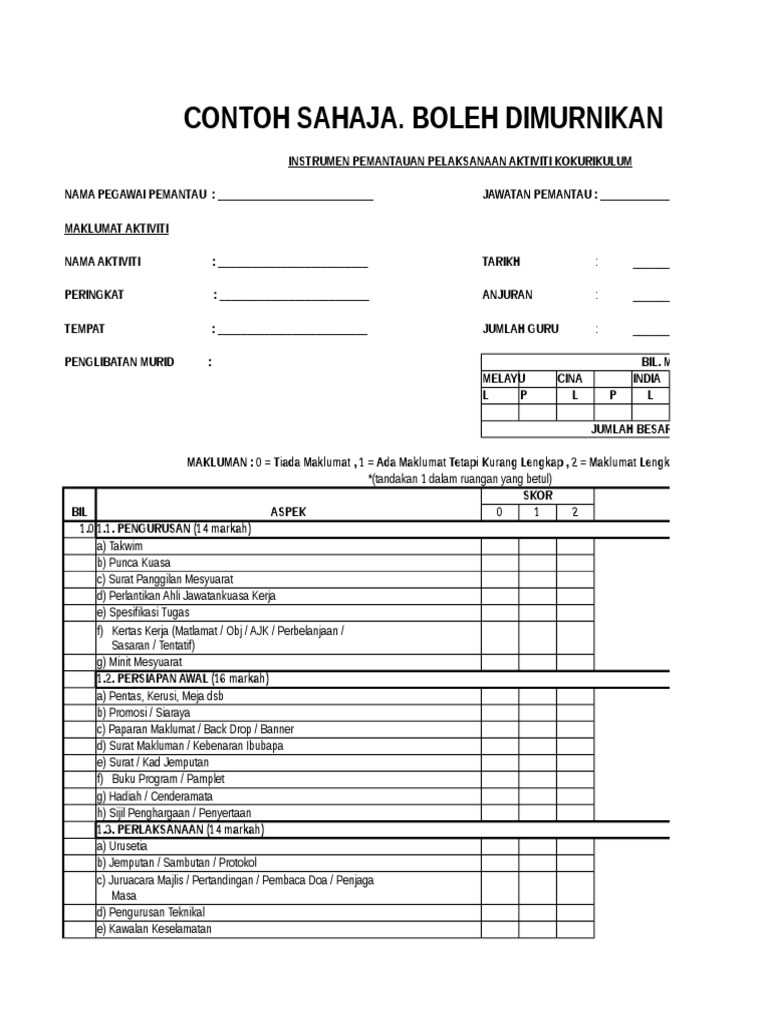 Borang pemantauan aktiviti kokurikulum mp3 & mp4. Pemantauan aktiviti kokurikulum hendaklah dilakukan oleh pihak pengurusan kokurikulum untuk memastikan keberkesanan pengurusan sesuatu badan. Borang permohonan pindaan aktiviti pelajar. Pemantauan fail 1 murid 1 sukan berasakan skpm versi 2010. Kementerian pendidikan malaysia (kpm) telah membangunkan satu sistem pentaksiran aktiviti jasmani, sukan dan kokurikulum.