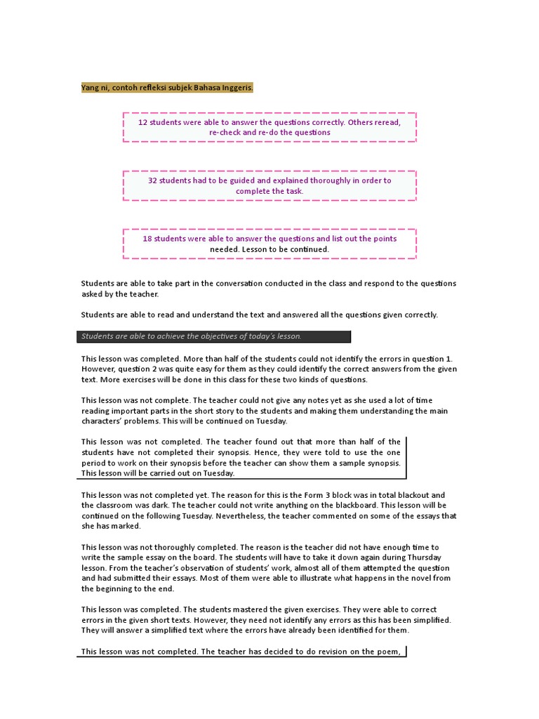 Contoh penulisan refleksi dan impak sesi p&p telah mencapai objektif/target yang diingini murid2 dapat menguasai kesemua aras p&p murid2 dapat menguasai kesemua kemahiran yang dipelajari murid2 dapat menguasai kemahiran.